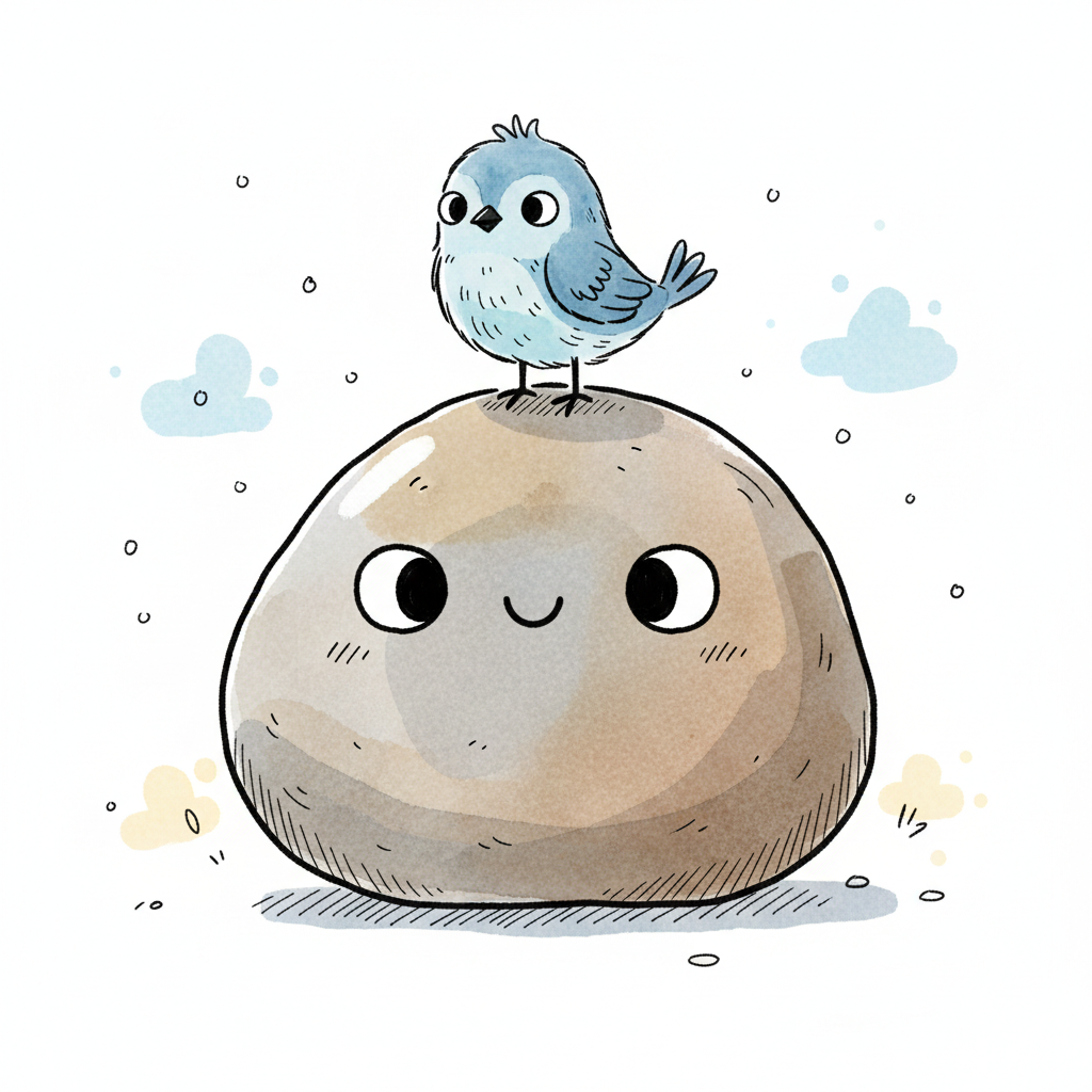 Ein süßer blauer Vogel sitzt auf einem lächelnden Stein. Aquarell-Illustration, freundlich.