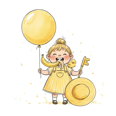 Fröhliches Mädchen in Gelb mit Banane, Ballon, Küken, Schlüssel und Hut.