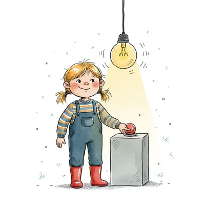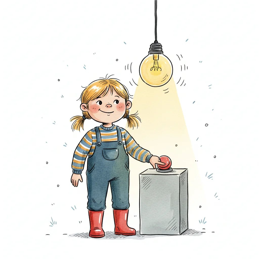 Ein lächelndes Mädchen drückt einen roten Knopf, während eine Glühbirne über ihr leuchtet.