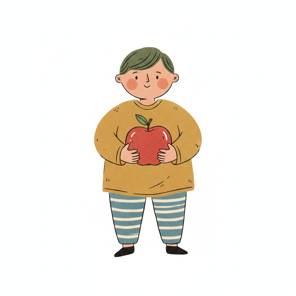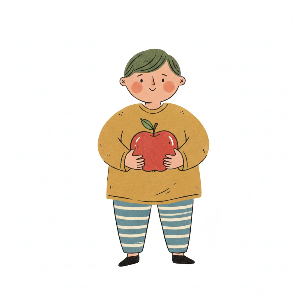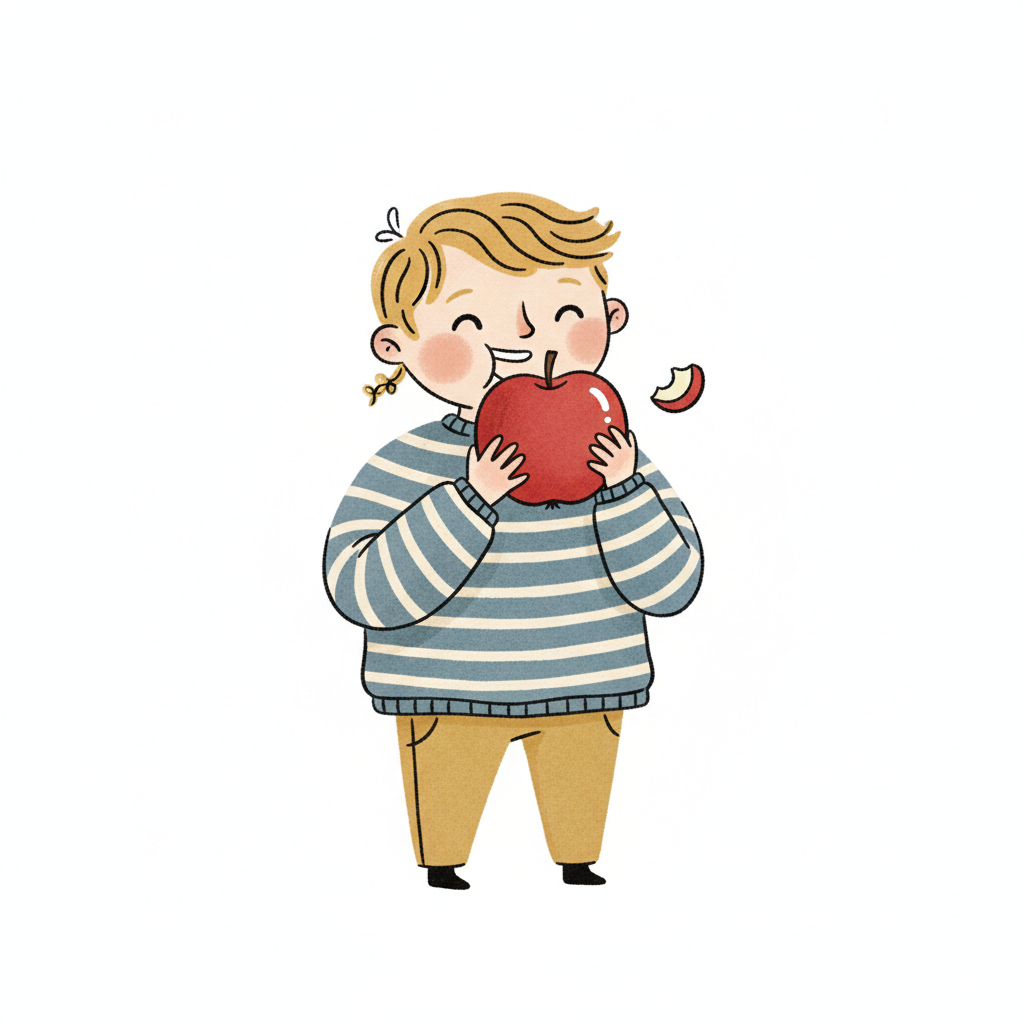 Ein Junge mit Apfel, lächelt und trägt einen gestreiften Pullover.