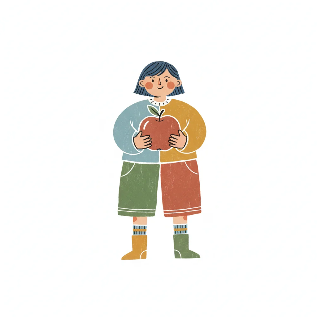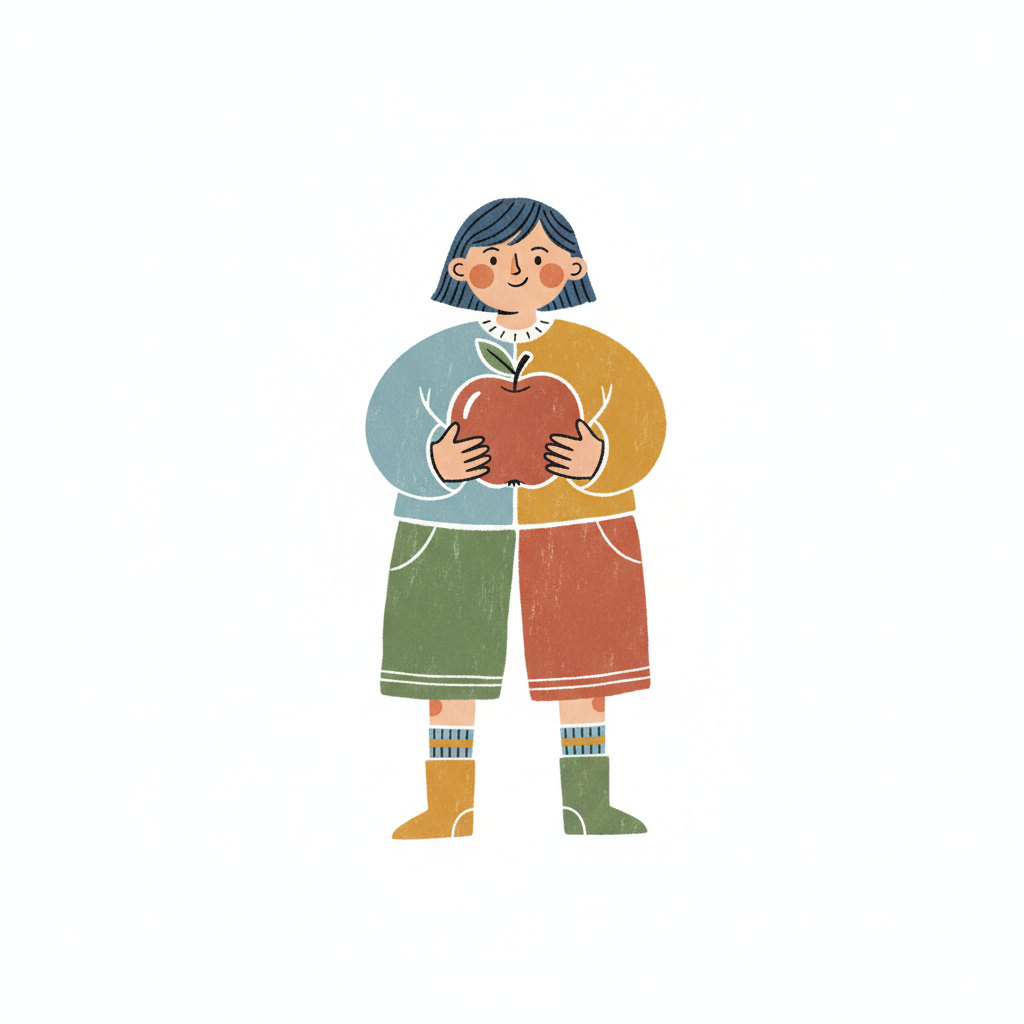 Handgezeichnete Kinderbuchillustration im modernen skandinavisch-nordischen Stil. Minimalistische, freundliche Figur mit einfachen Formen und leicht unregelmäßigen, handgezeichneten Linien. Ruhige, gedeckte Farbpalette, viel freie Fläche, reduzierte Details, sanfte Papier- oder Aquarellstruktur. Warme, ruhige, leicht humorvolle Stimmung, flächige Komposition ohne starke Perspektive, moderner nordischer Illustrationsstil, charmant und zeitlos.