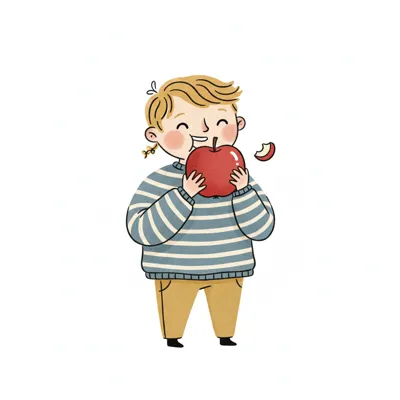 Ein Junge mit gestreiftem Pullover isst einen Apfel.