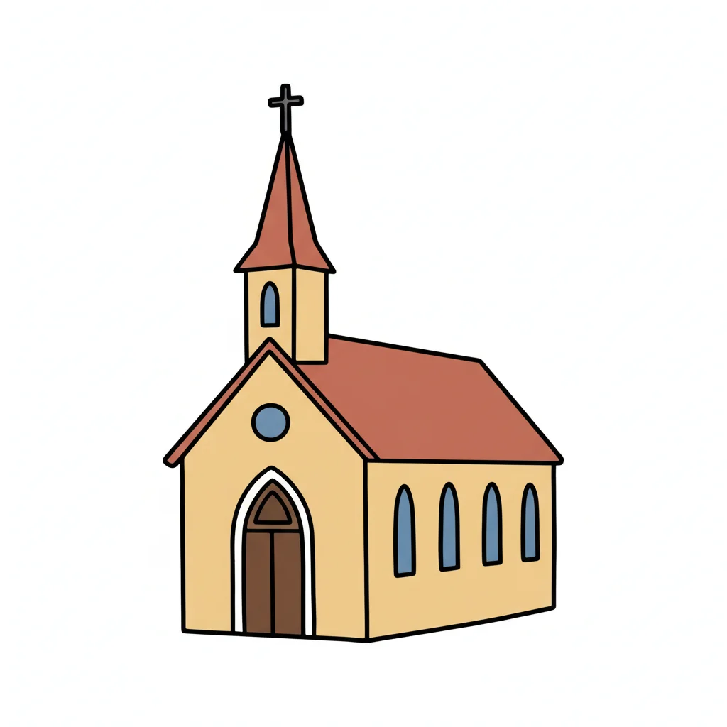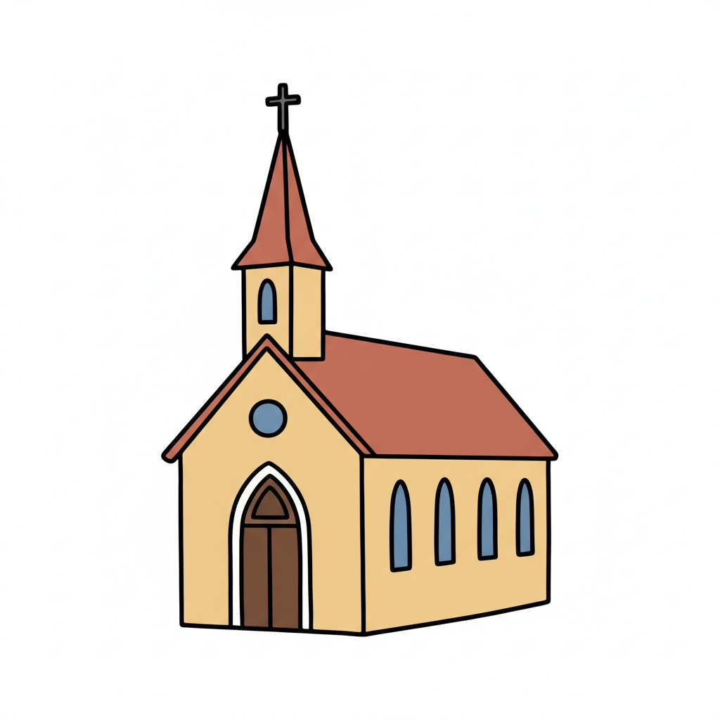 Eine einfache, bunte Zeichnung einer Kirche mit Spitzdach.