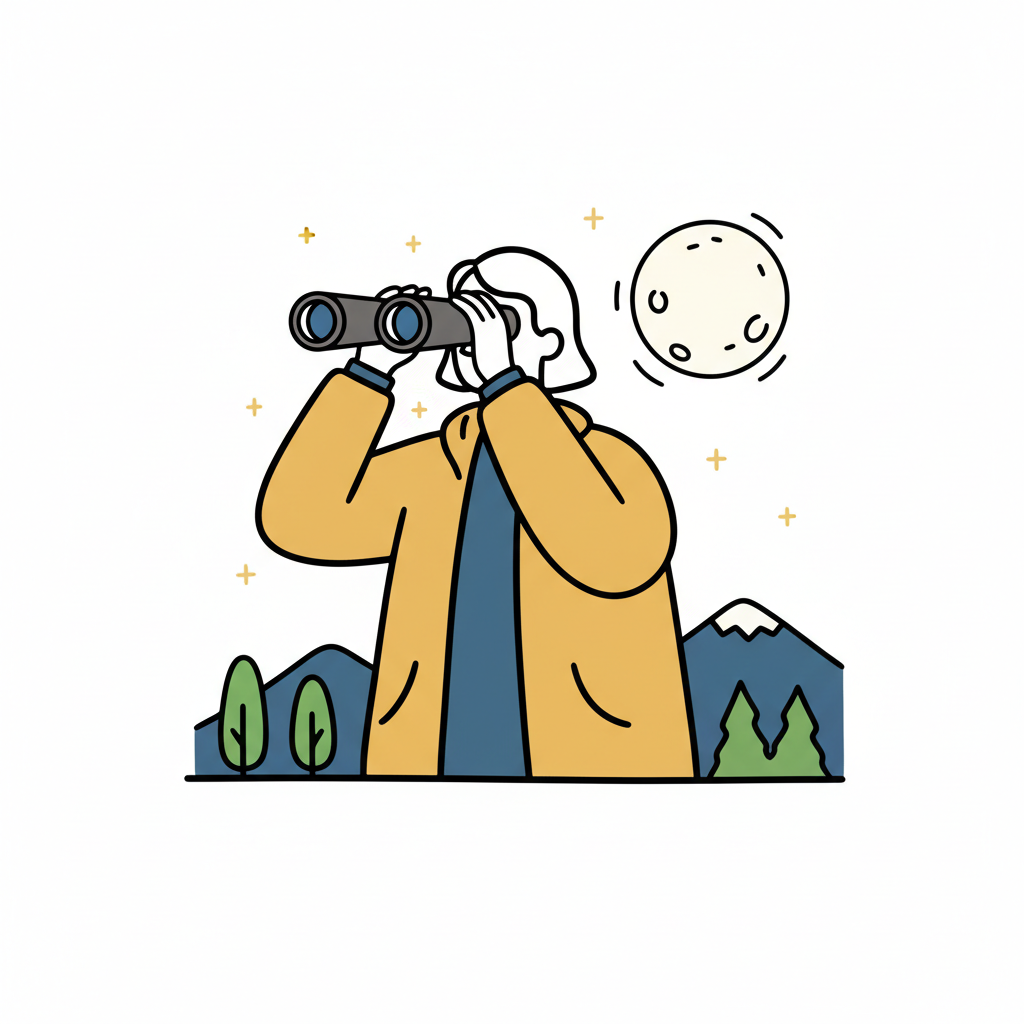 Eine Person beobachtet mit einem Fernglas den Mond und Sterne über einer Berglandschaft.