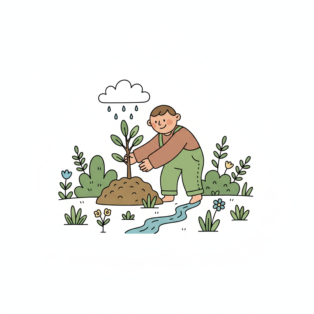 Ein fröhlicher Gärtner pflanzt einen Baum im Regen, umgeben von Blumen und einem kleinen Bach.