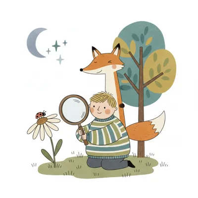 Ein Junge und ein Fuchs beobachten einen Marienkäfer auf einer Blume mit einer Lupe.