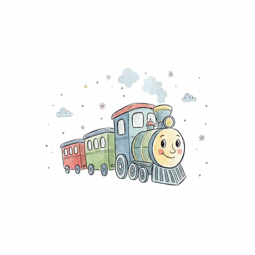 Niedlicher, lächelnder Cartoon-Zug mit zwei Waggons in Aquarell-Optik auf weißem Hintergrund.