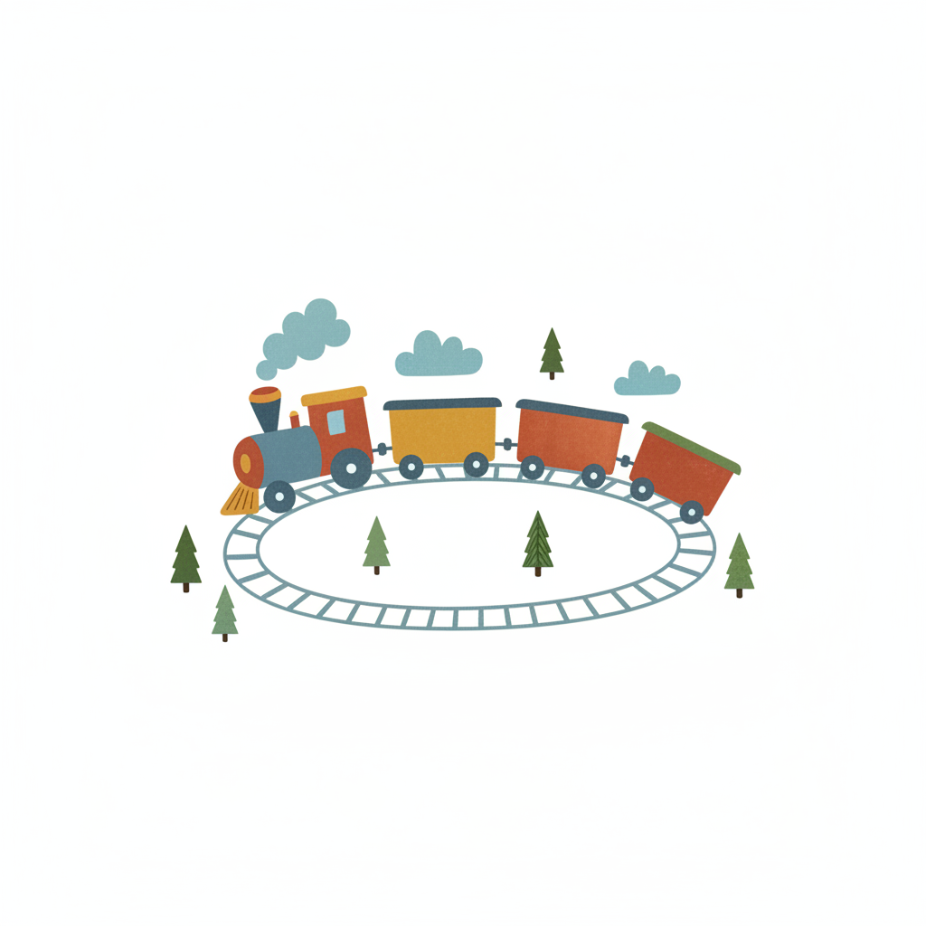 Bunter Cartoon-Zug fährt auf einer kreisförmigen Schiene mit Bäumen und Wolken.