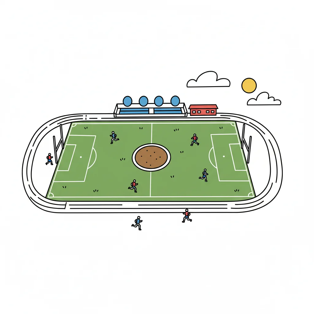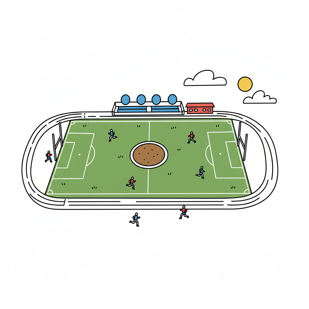 Gezeichnetes Sportstadion mit grünem Fußballfeld, Laufbahn und kleinen Figuren. Sonne am Himmel.