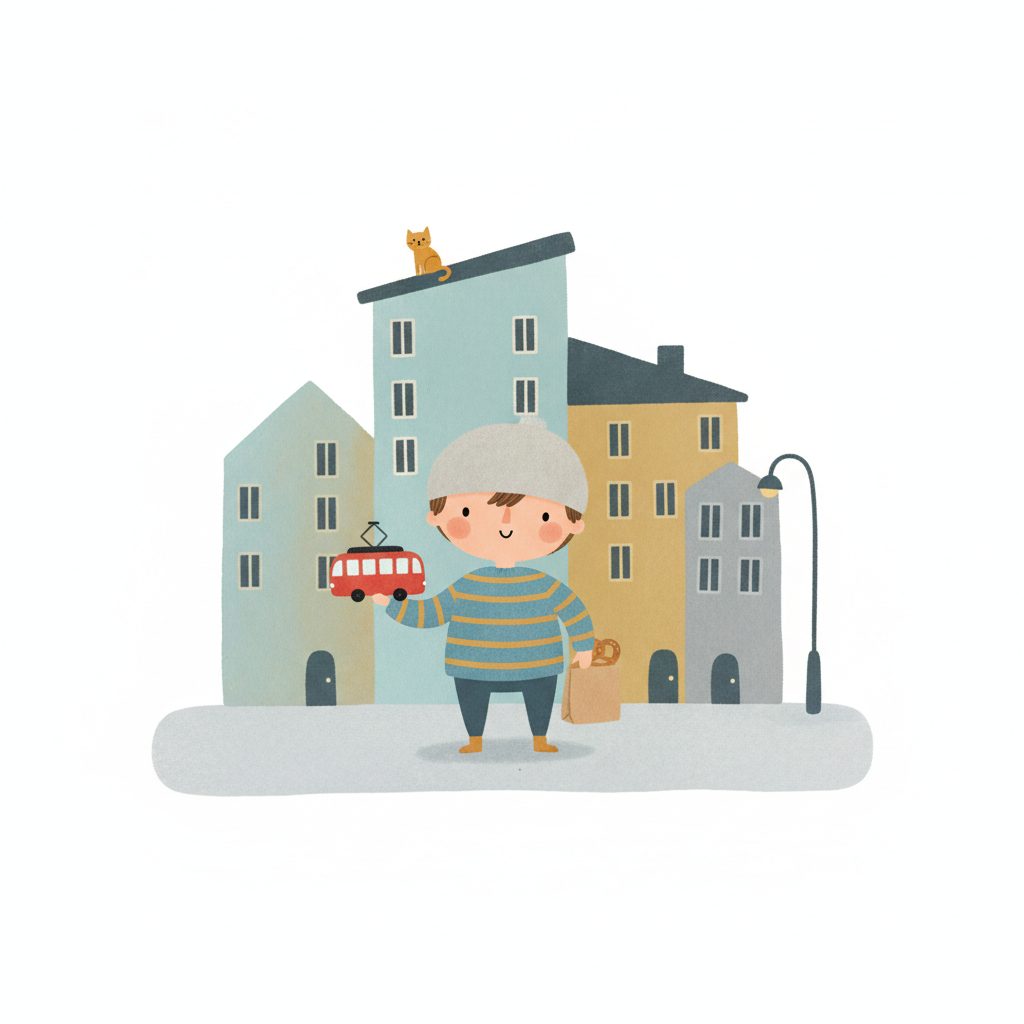 Niedliche Illustration: Junge mit Spielzeugstraßenbahn vor bunten Häusern und Katze auf dem Dach.