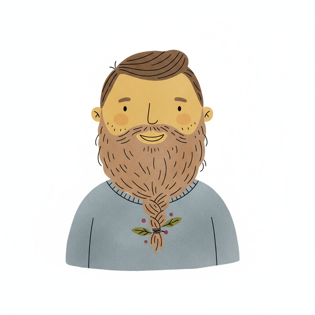 Illustration eines lächelnden Mannes mit geflochtenem Bart, verziert mit Blättern und Beeren.