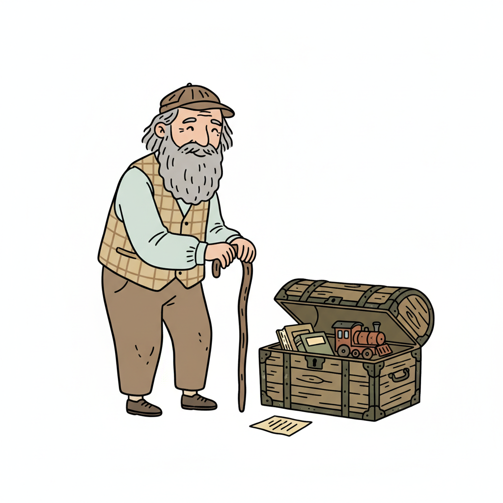 Ein alter Mann mit Bart und Gehstock steht lächelnd neben einer Truhe voller Erinnerungen.