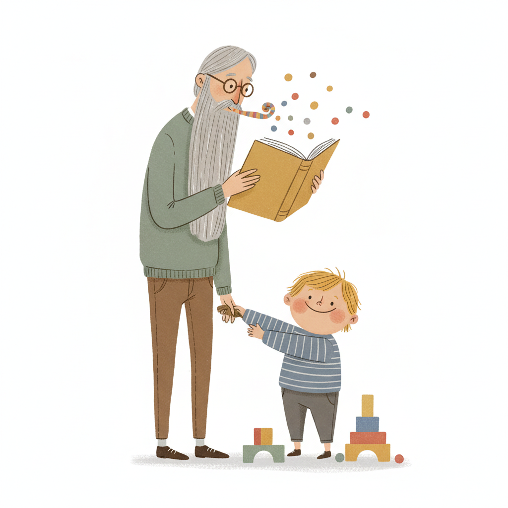 Opa liest Buch, Kind kämmt Bart. Bunte Punkte fliegen. Fröhliche Familienszene.