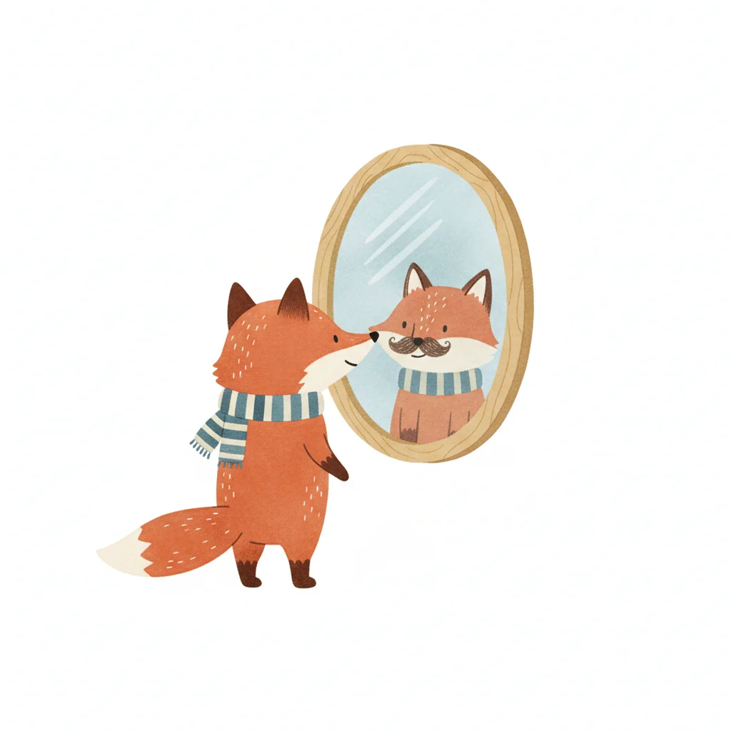 Niedlicher Fuchs mit Schal betrachtet sein Spiegelbild mit Schnurrbart.