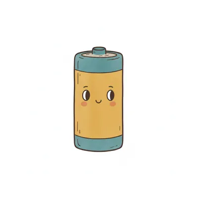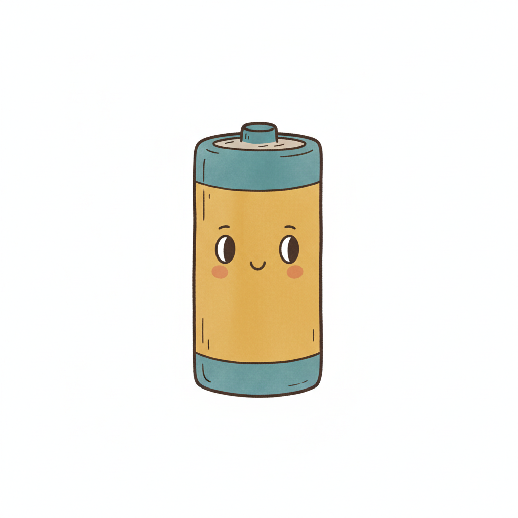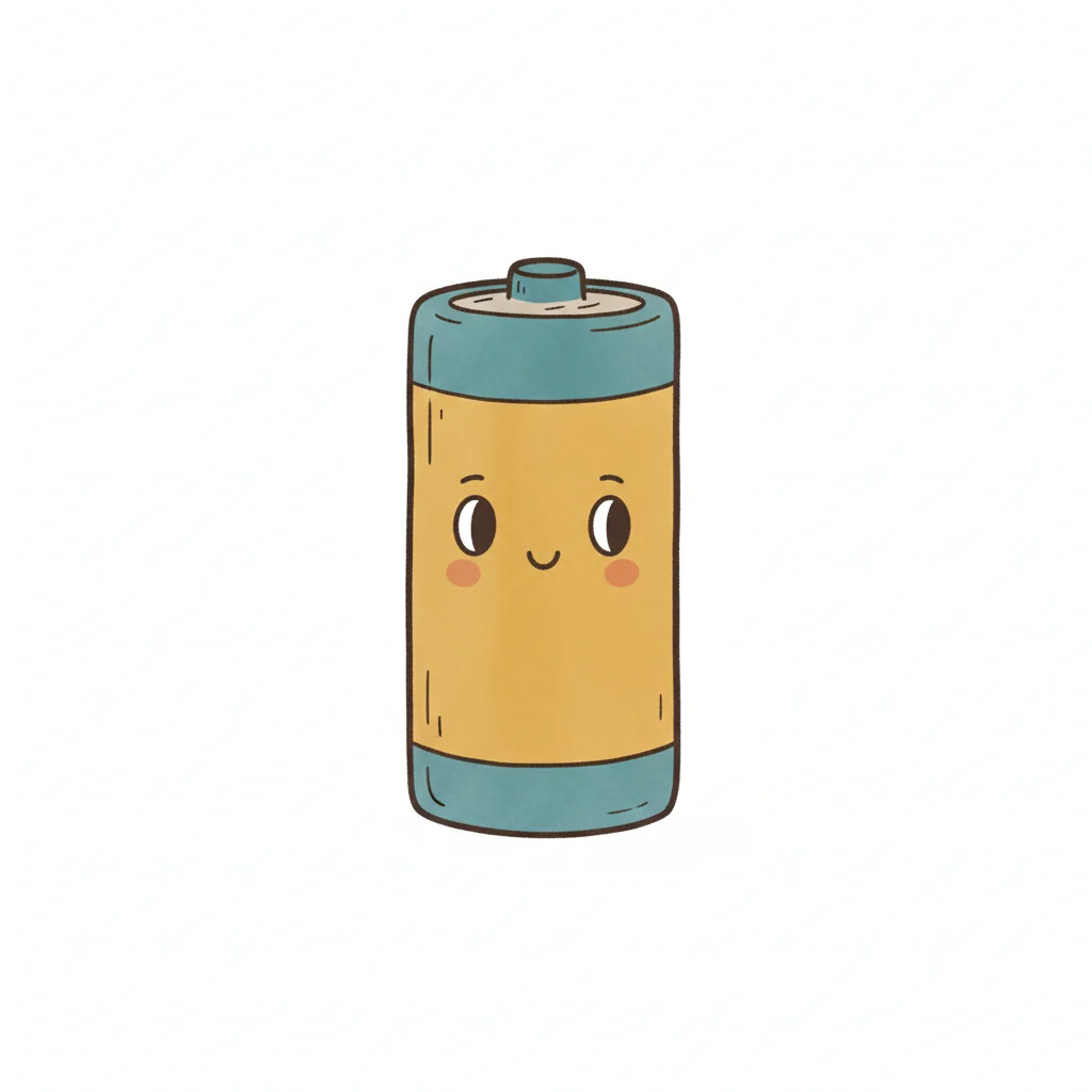 Eine handgezeichnete, gelbe Batterie mit blauem Band und Plus-Minus-Symbolen auf weißem Hintergrund.