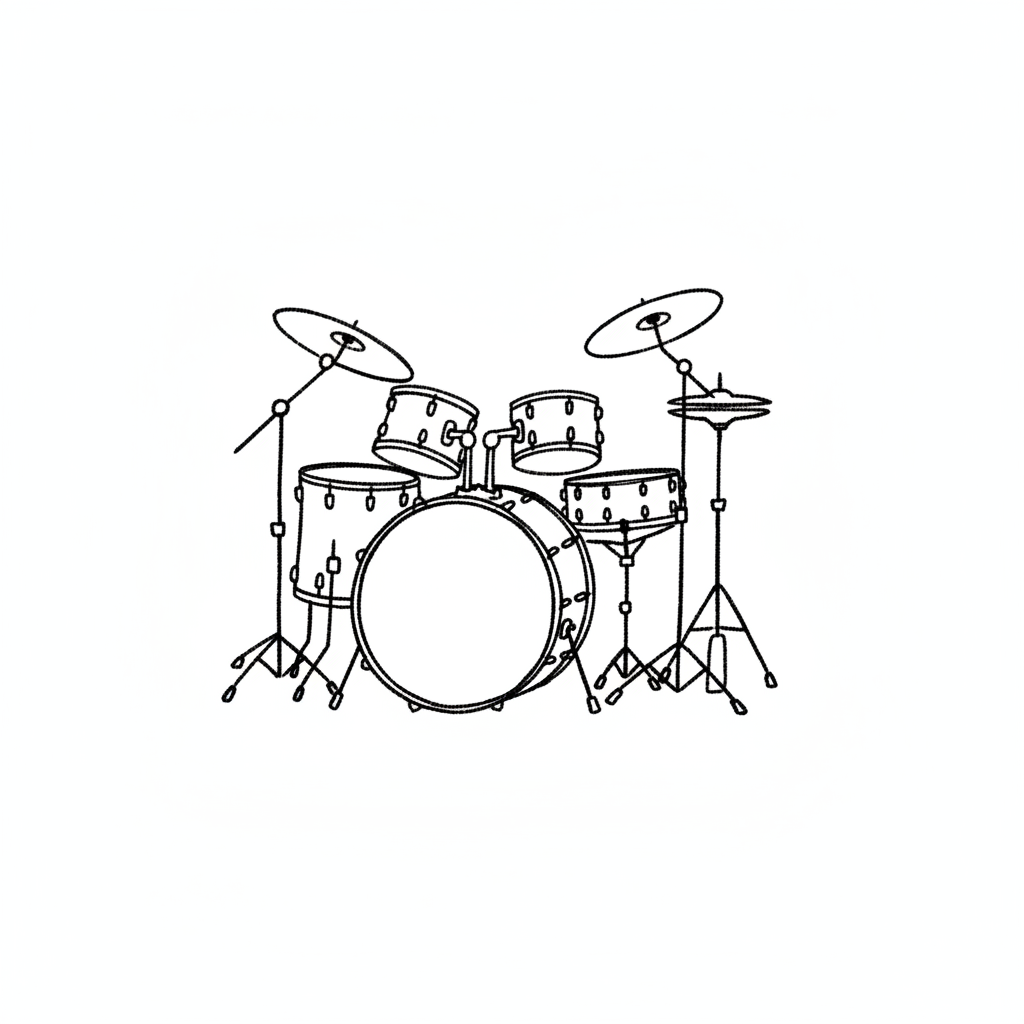 Minimalistische Schwarz-Weiß-Strichzeichnung eines Schlagzeugs mit Trommeln und Becken.