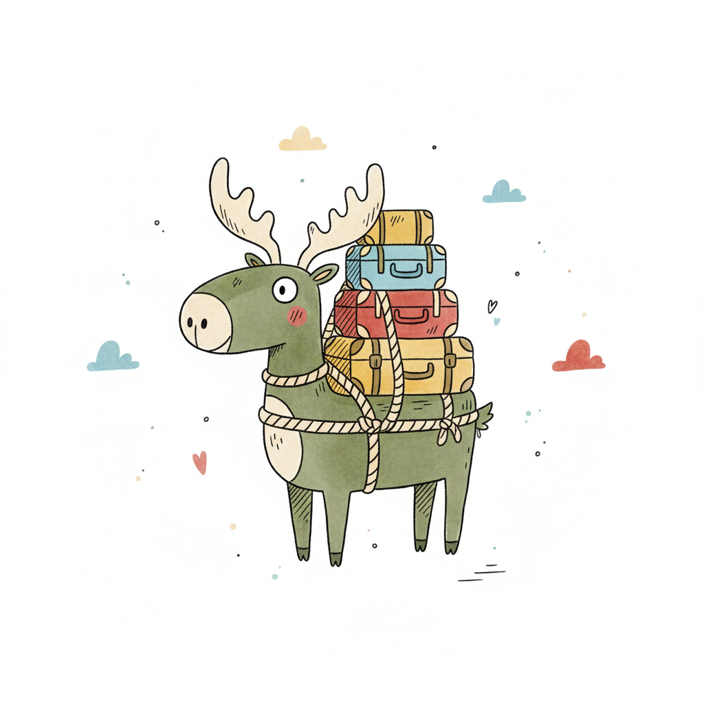 Niedlicher Elch mit einem Stapel bunter Koffer auf dem Rücken, bereit für eine Reise.