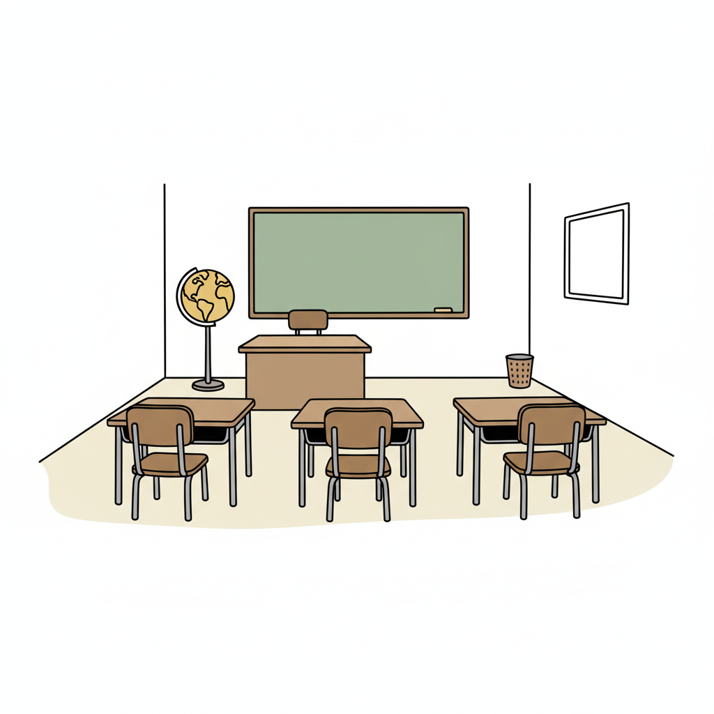 Ein Klassenzimmer mit Tafel, Stühlen, Tisch und Globus.