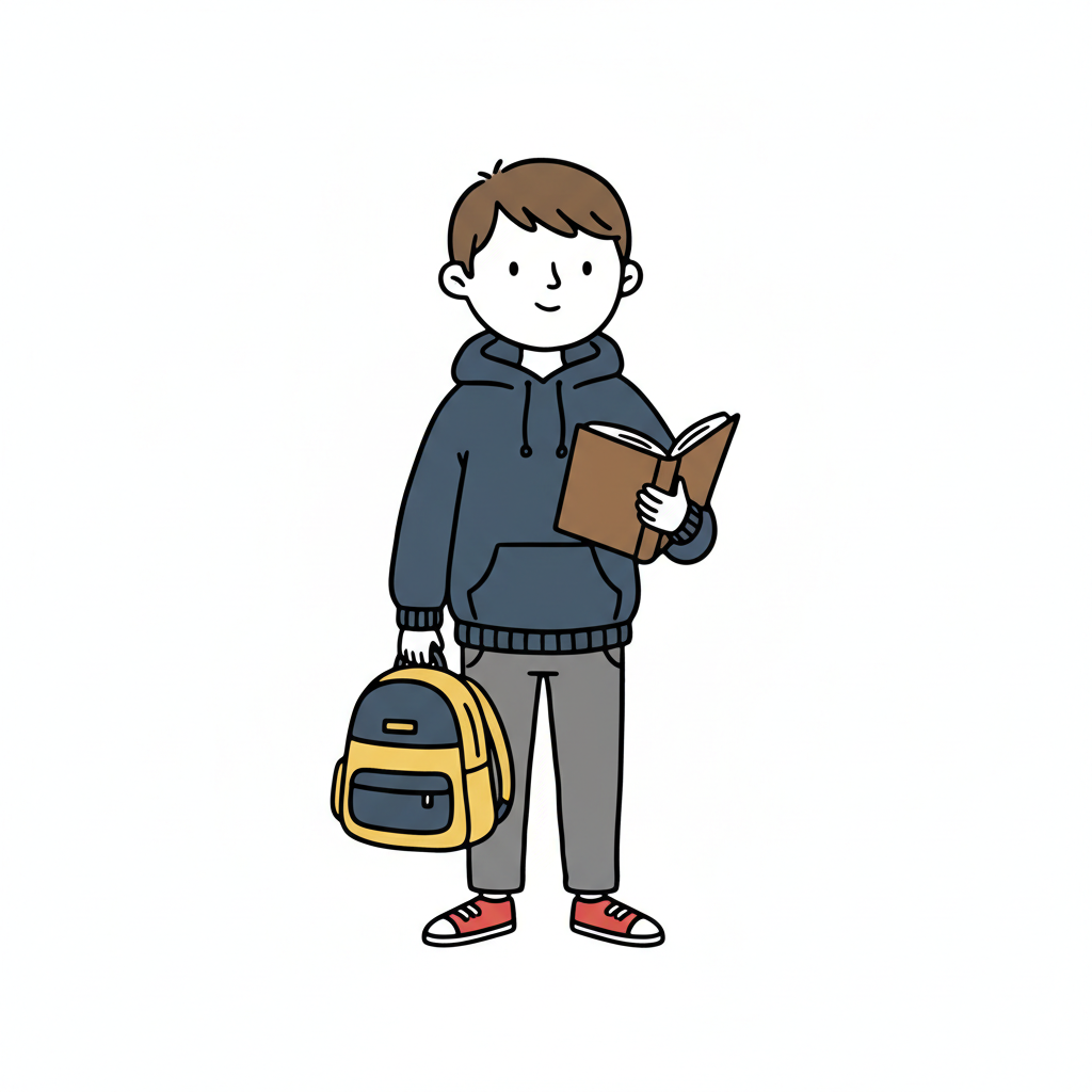 Junger Schüler mit Rucksack und Buch in der Hand.