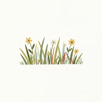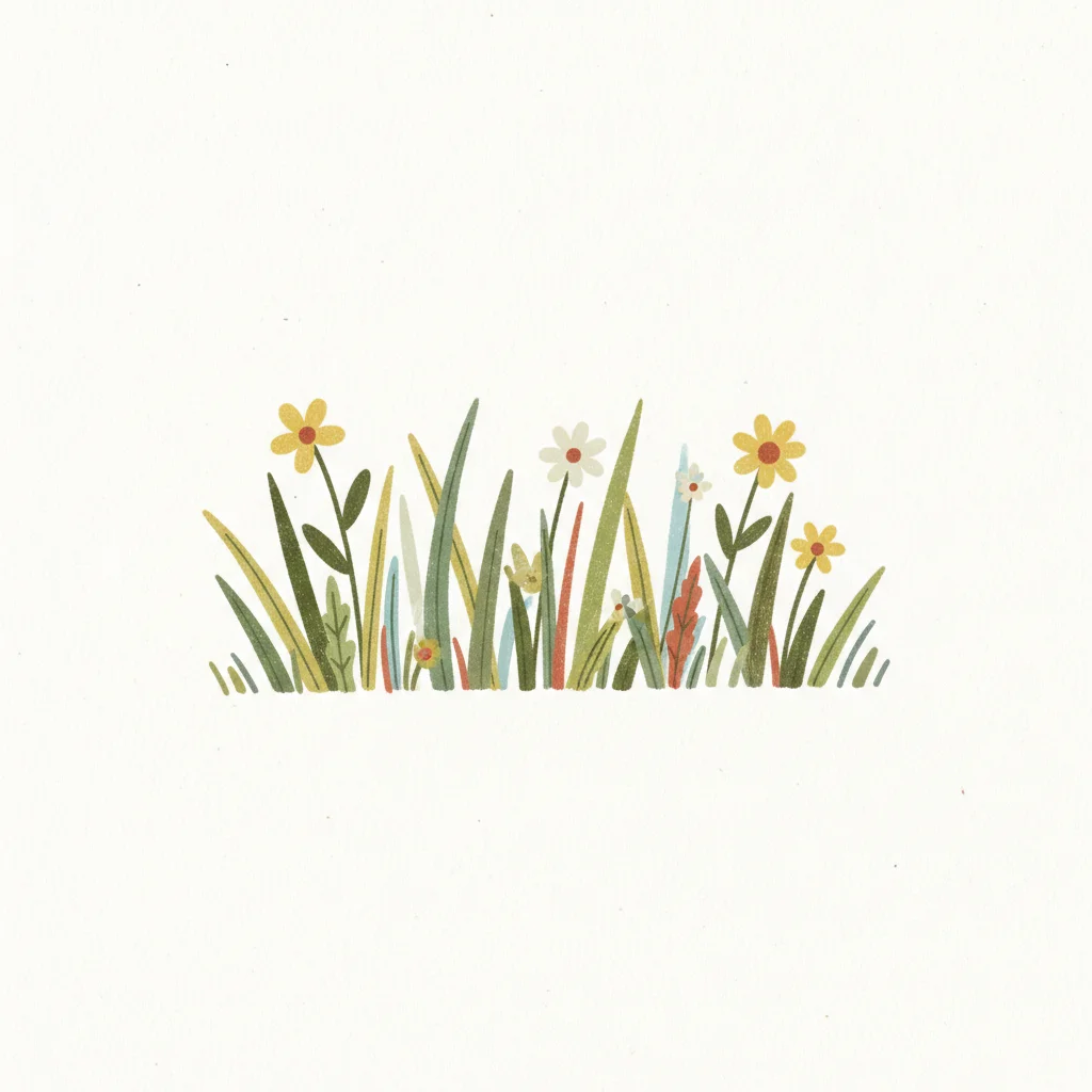 Buntes Blumenfeld mit grünem Gras auf hellem Hintergrund.