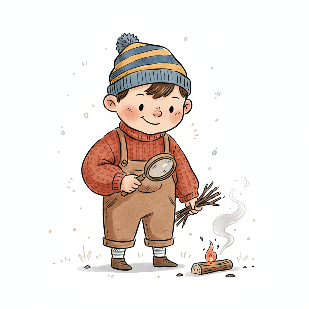 Cartoon-Junge mit Lupe und Stöcken entfacht ein kleines Feuer.