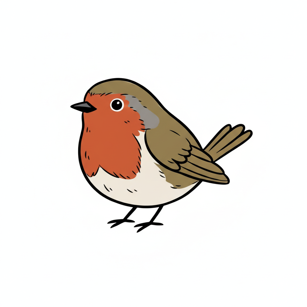 Ein cartoonhaftes Rotkehlchen mit rötlicher Brust und braunem Gefieder.