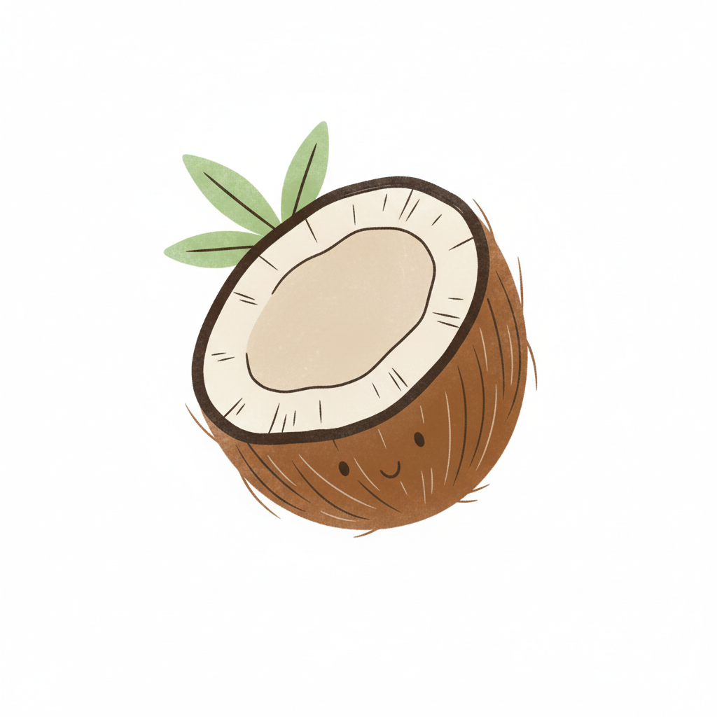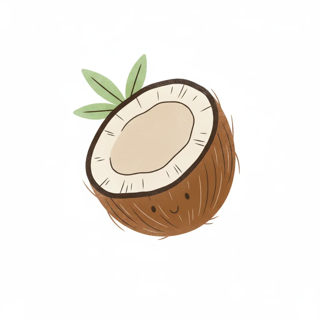 Eine süße, cartoonhafte Darstellung einer halbierten Kokosnuss.