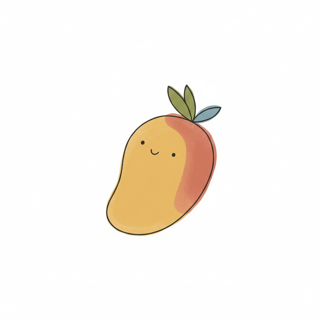 Eine freundliche, cartoonartige Mango mit einem lächelnden Gesicht.