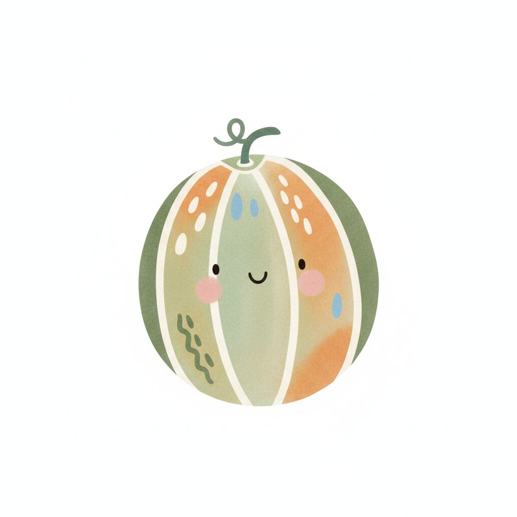 Niedliche, cartoonartige Melone mit Gesicht und fröhlicher Ausstrahlung.