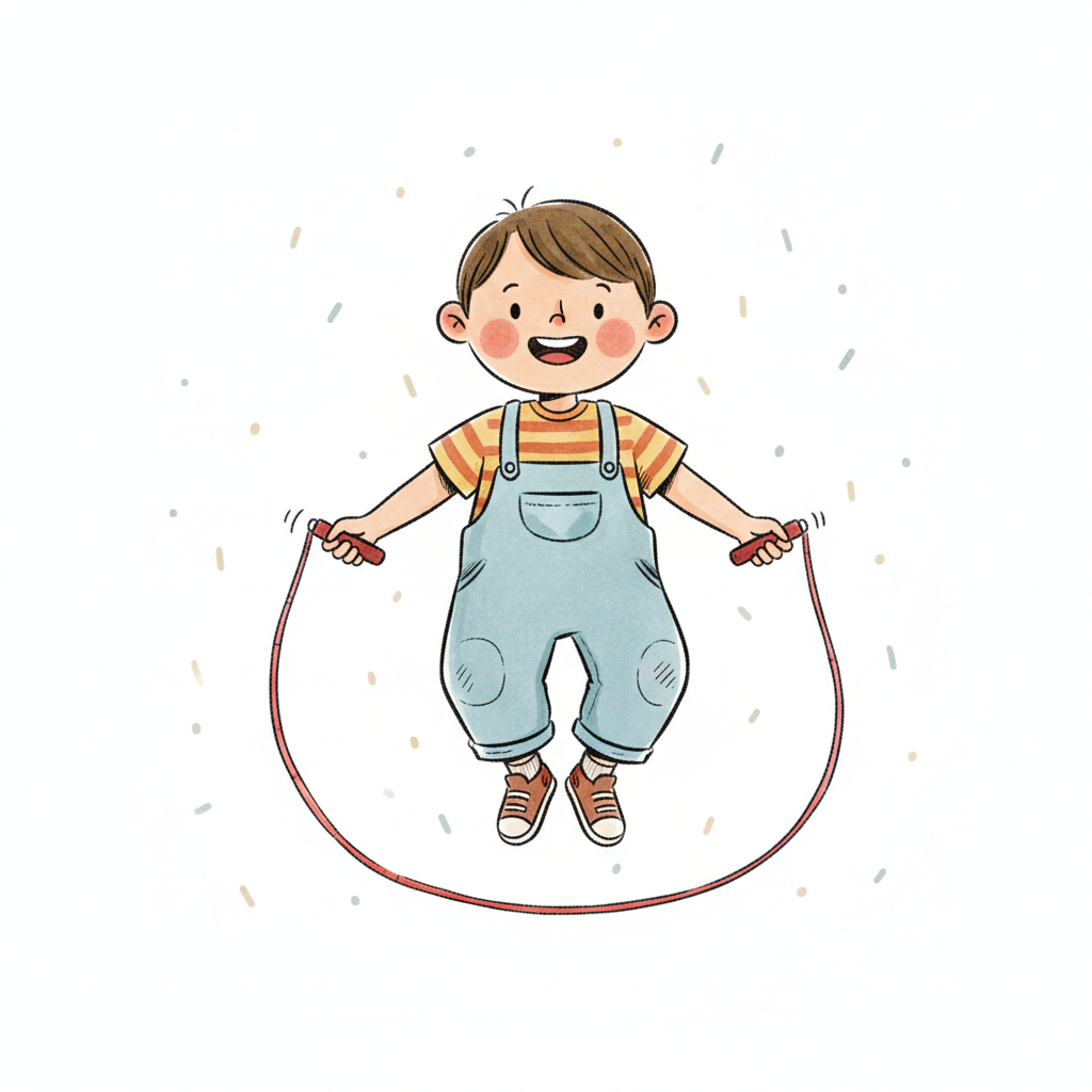 Fröhlicher Cartoon-Junge springt Seil in Latzhose und gestreiftem Shirt auf weißem Hintergrund.