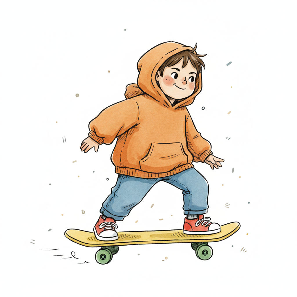Ein fröhlicher Cartoon-Junge in orangefarbenem Hoodie fährt Skateboard.