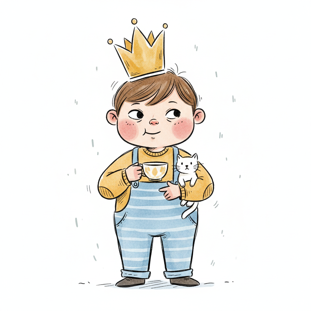Niedlicher Cartoon-Junge mit Krone, Teetasse und Katze auf dem Arm.