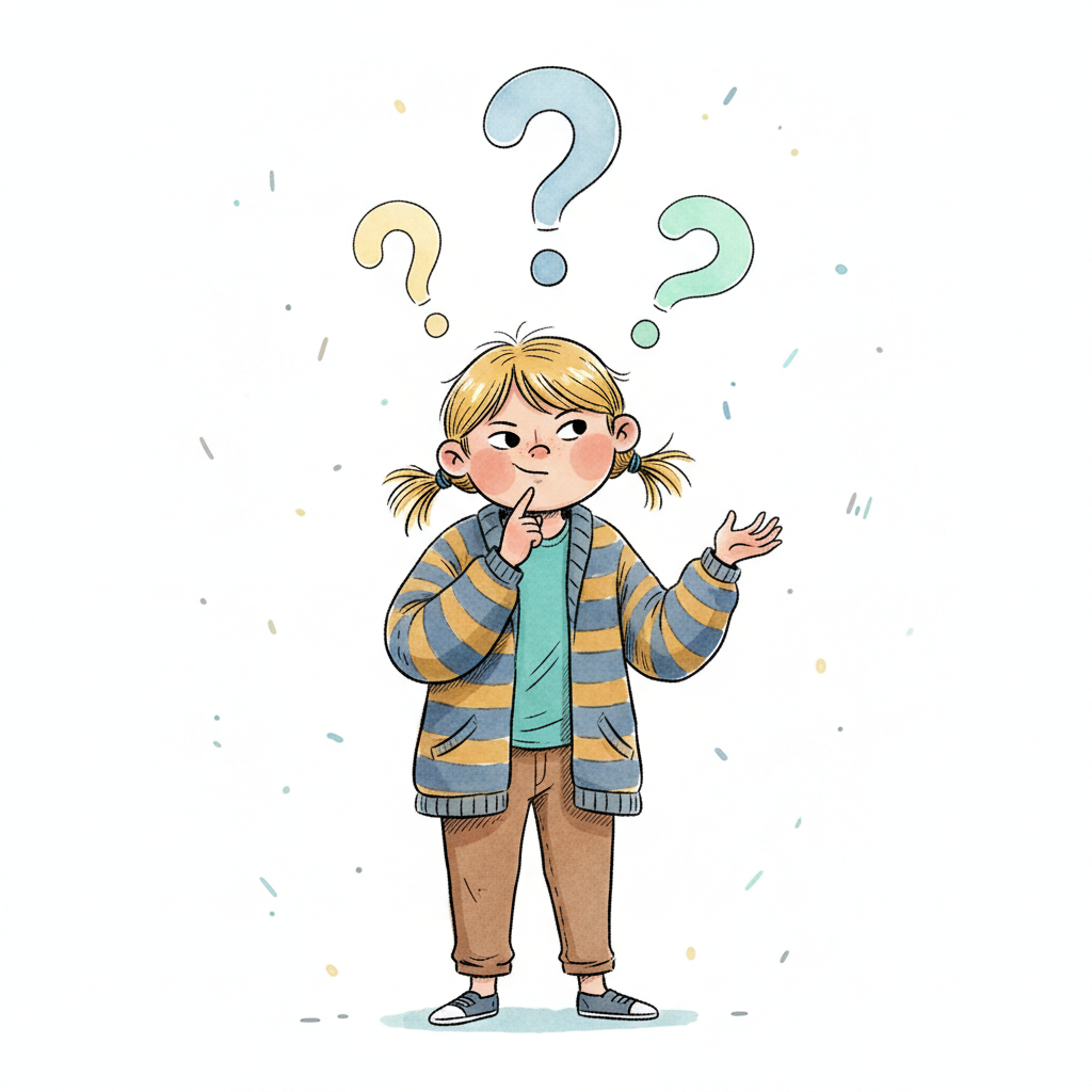 Nachdenkliches Cartoon-Mädchen mit Zöpfen und Fragezeichen über dem Kopf, das überlegt.