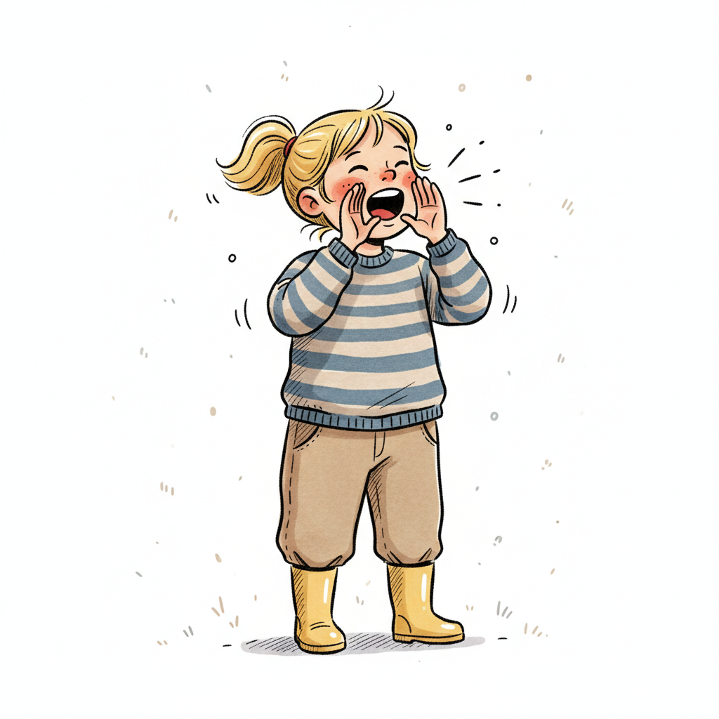 Cartoon-Mädchen schreit laut mit Händen am Mund, trägt gestreiften Pullover und gelbe Stiefel.