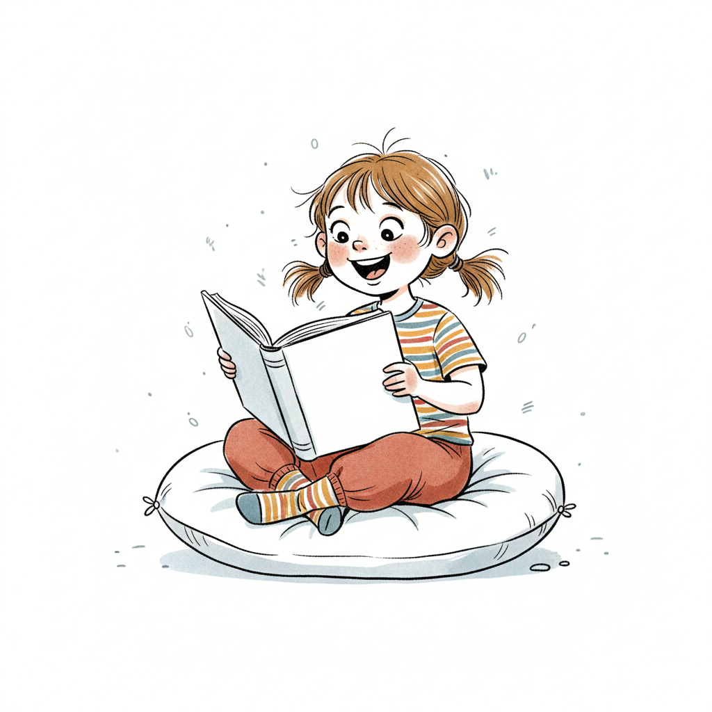 Glückliches Cartoon-Mädchen mit Zöpfen liest ein Buch auf einem Kissen.