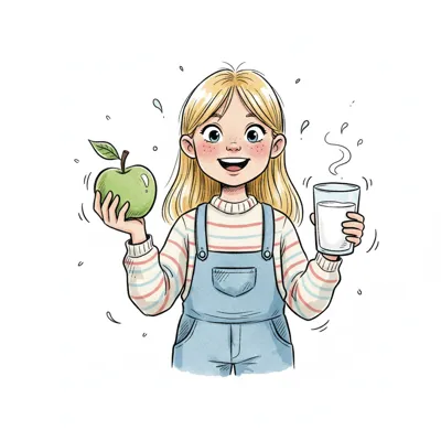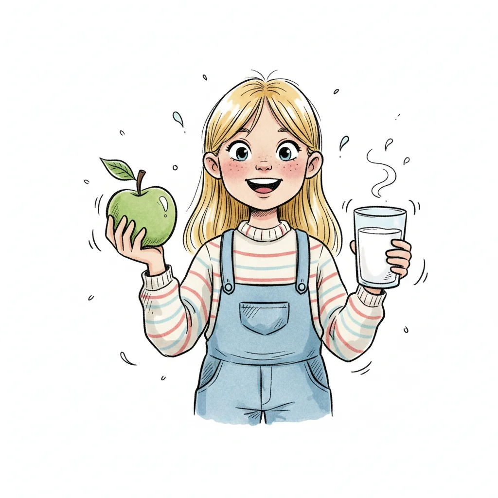 Fröhliches Cartoon-Mädchen hält einen grünen Apfel und ein Glas Milch, symbolisiert gesunde Ernährung.