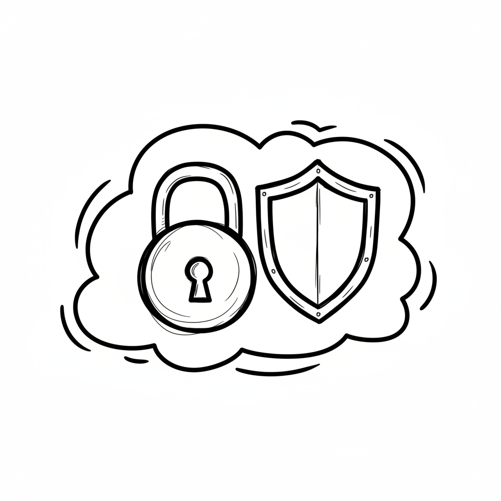 Handgezeichnetes Vorhängeschloss und Schild in einer Wolke, symbolisiert Datensicherheit.