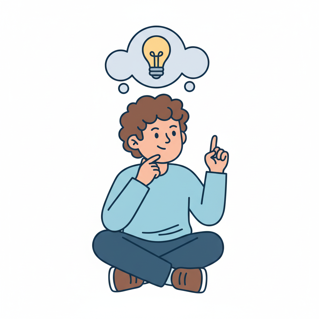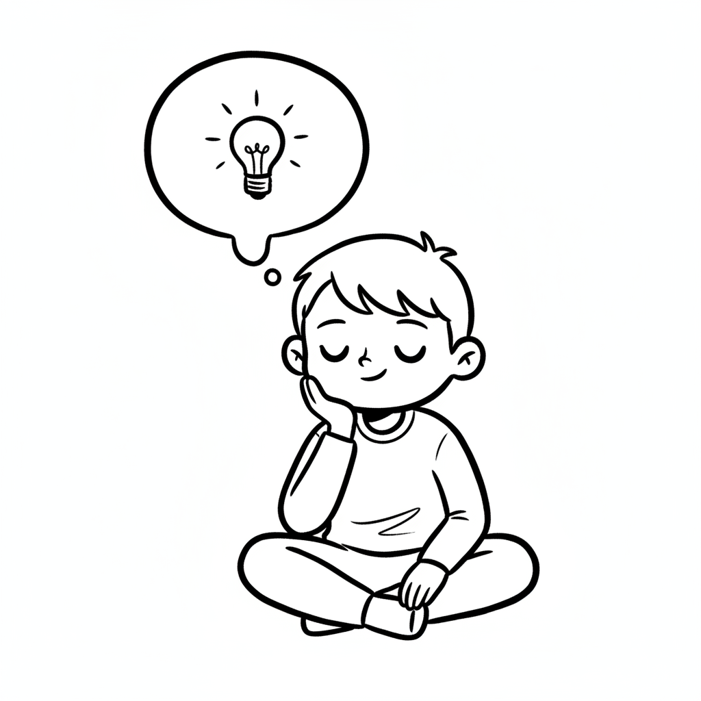 Ein Cartoon-Junge sitzt nachdenklich mit einer Glühbirne als Idee in einer Sprechblase.