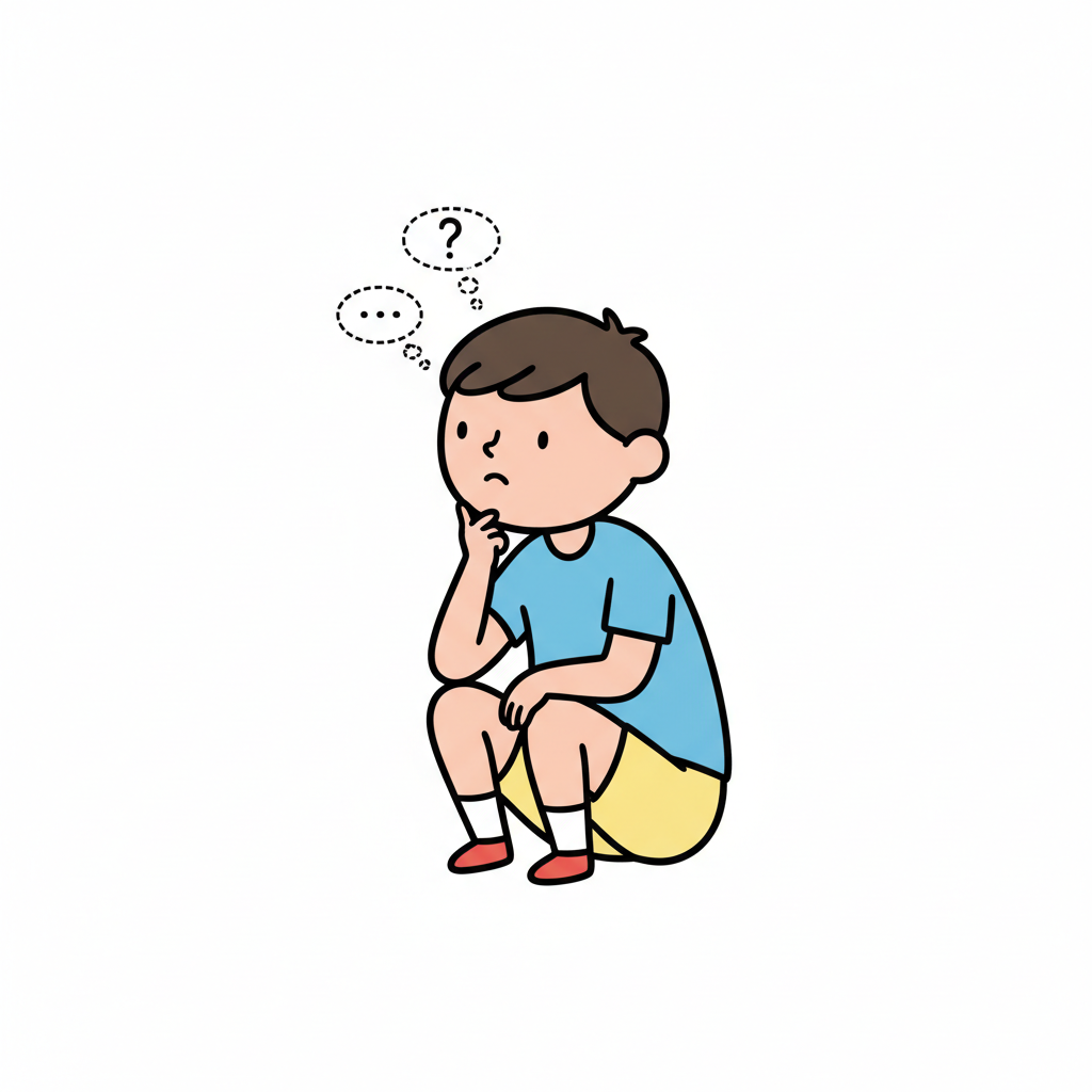 Ein Cartoon-Junge hockt und denkt nach, mit Fragezeichen und Punkten über dem Kopf.