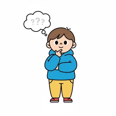 Ein nachdenklicher Cartoon-Junge in blauem Hoodie mit Fragezeichen in einer Gedankenblase.