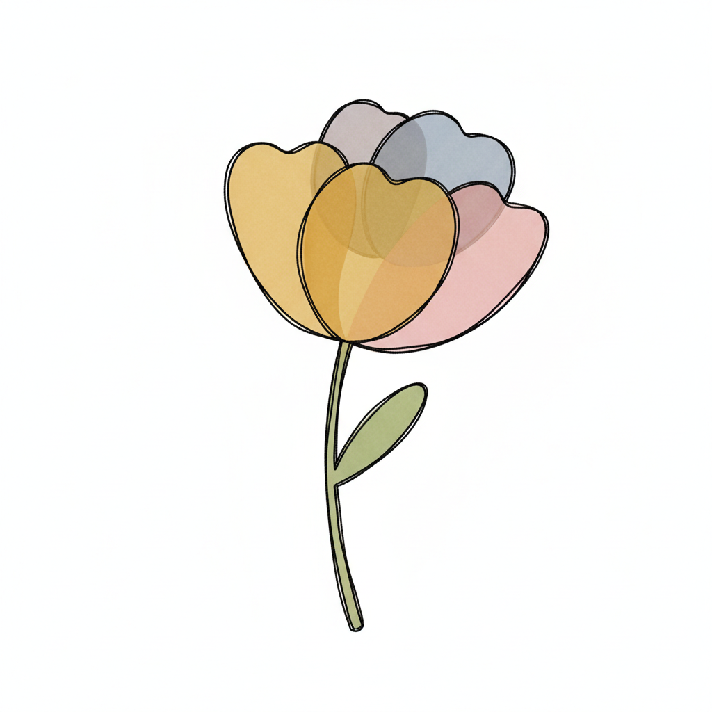 Bunte, stilisierte Blume mit drei Blütenblättern und einem grünen Stiel.