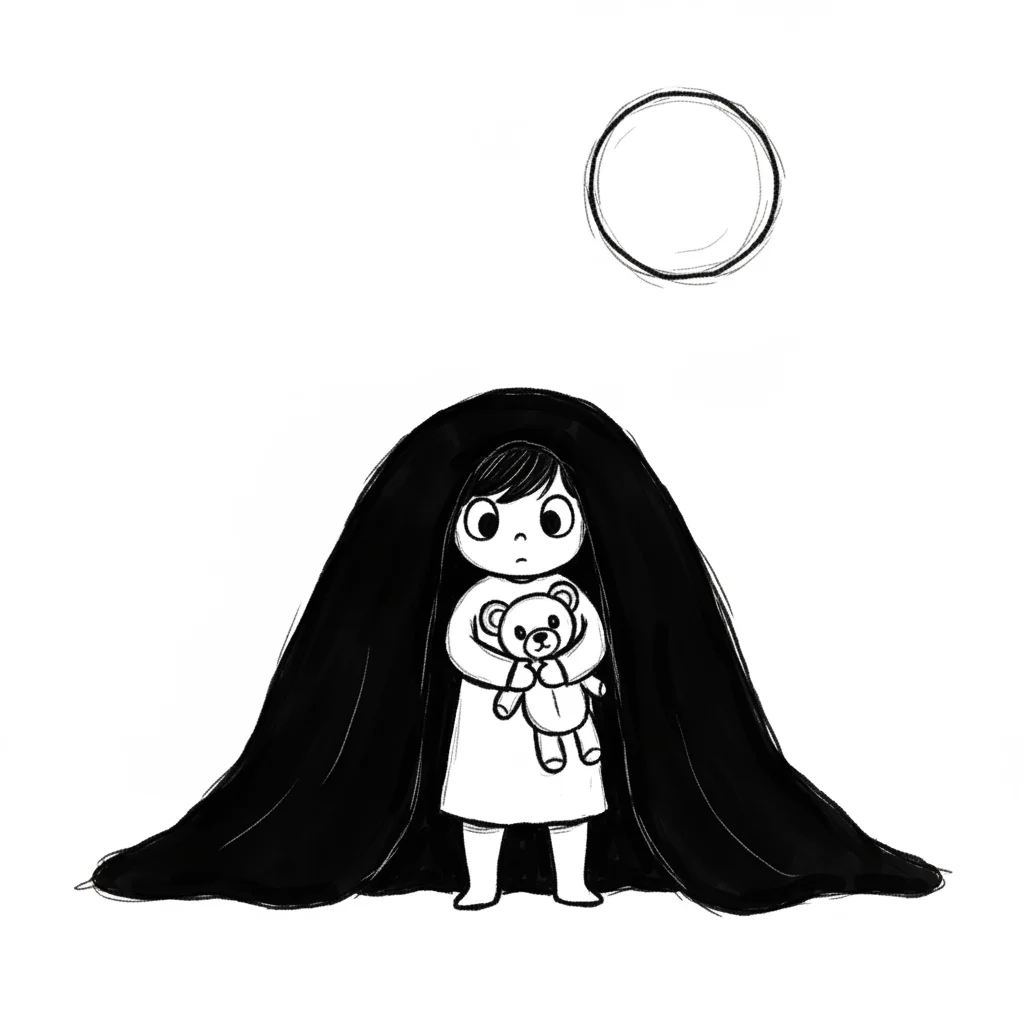 Schwarz-weiß-Illustration eines Kindes mit riesigem Haar, das einen Teddybär hält, unter einem Mond.