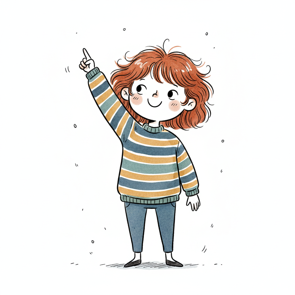 Fröhliches Cartoon-Mädchen mit roten Haaren und gestreiftem Pullover zeigt lächelnd nach oben.