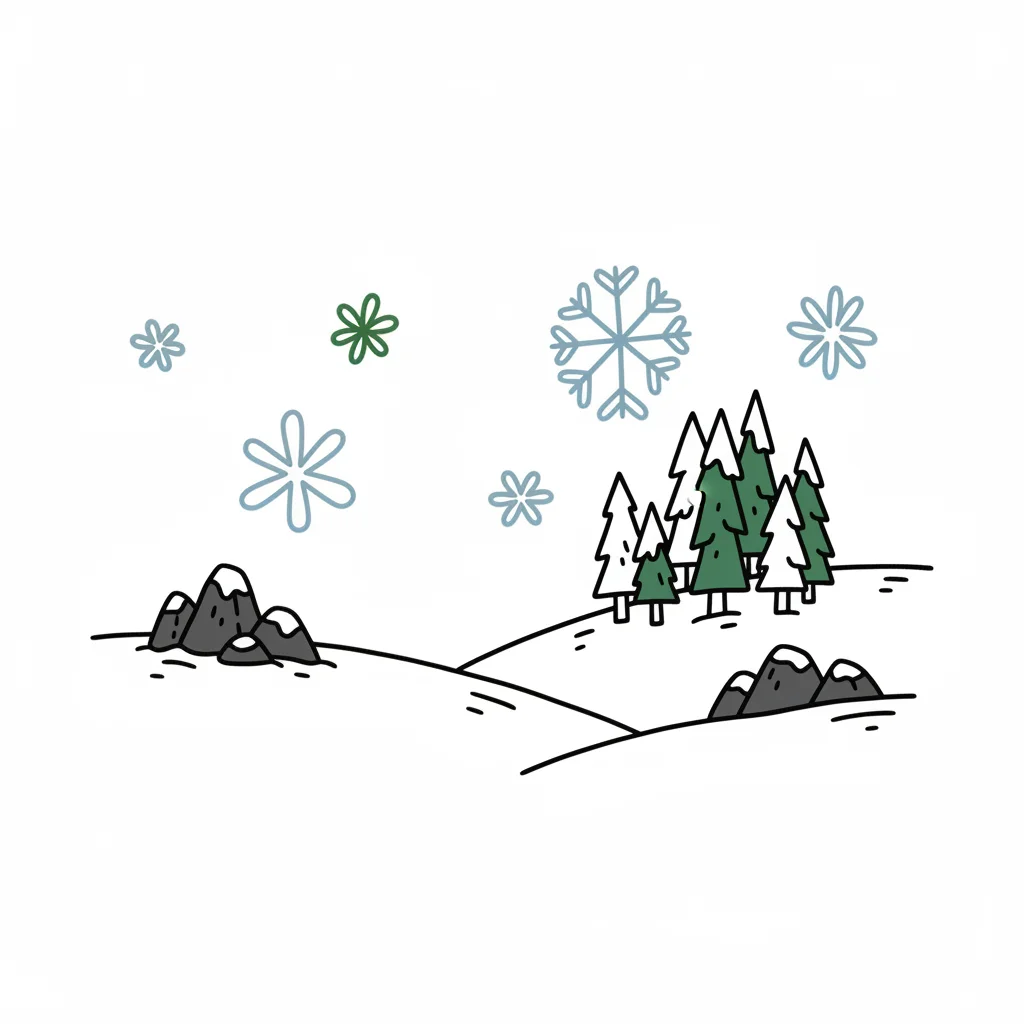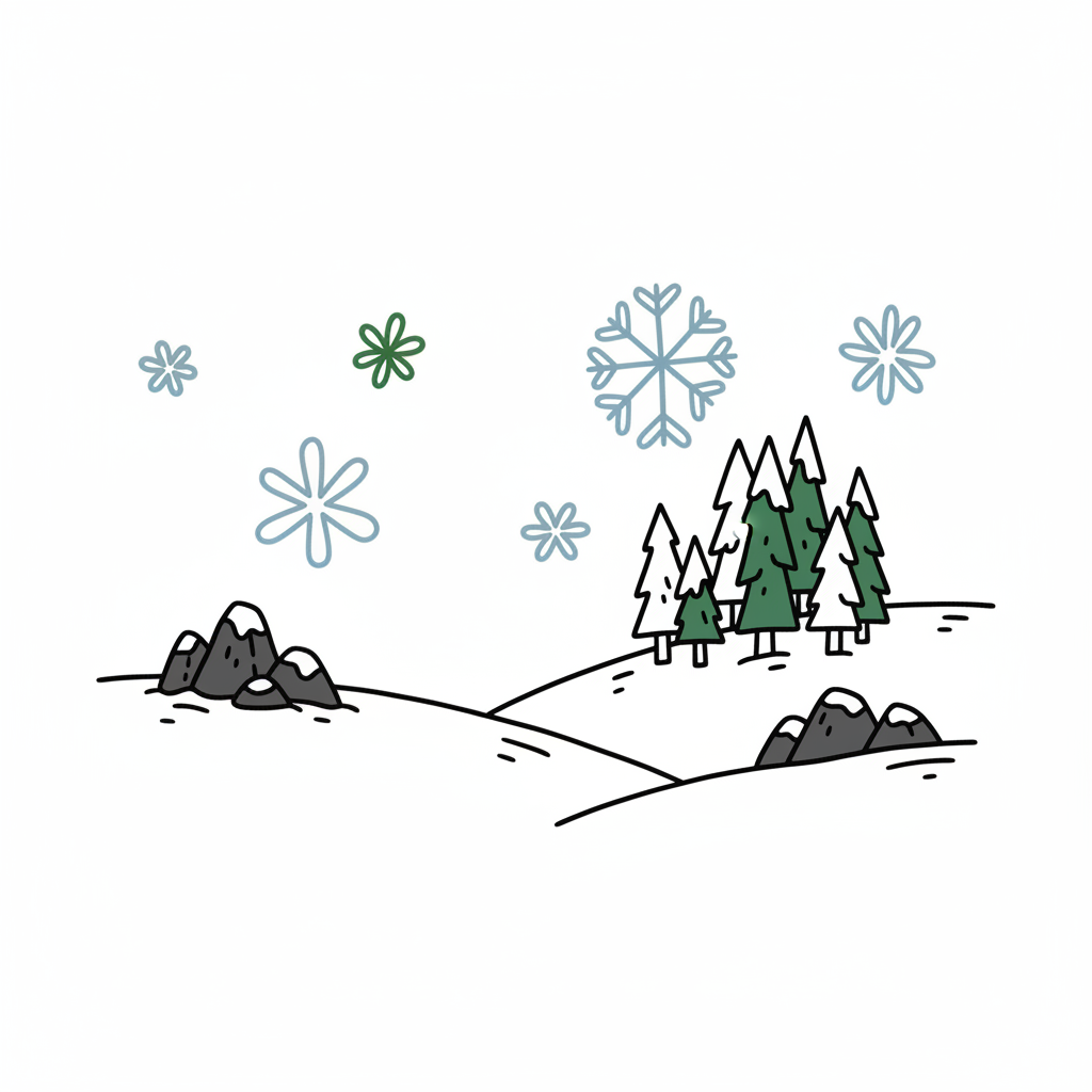 Schneebedeckte Landschaft mit verschneiten Bäumen und fallenden Schneeflocken.