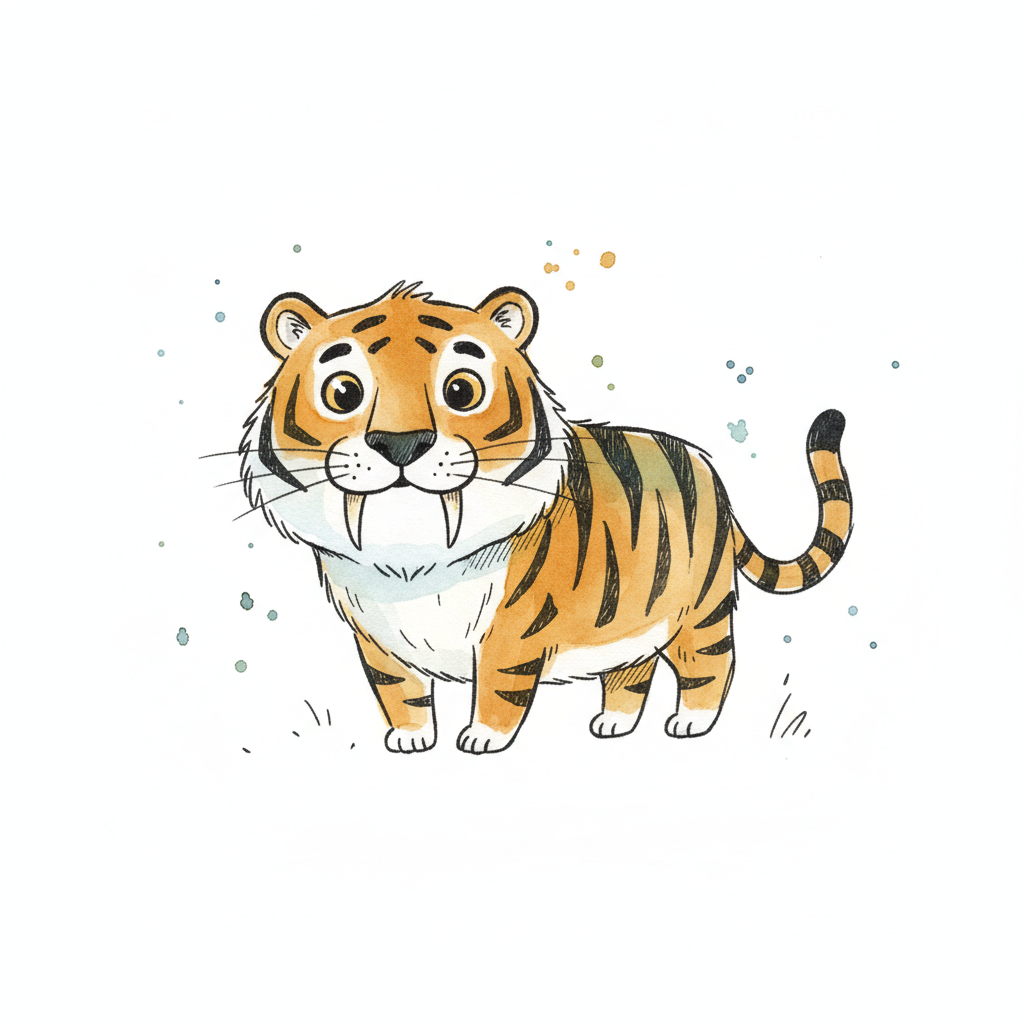Niedlicher Cartoon-Säbelzahntiger mit großen Zähnen und orange-schwarzem Fell auf weißem Hintergrund.