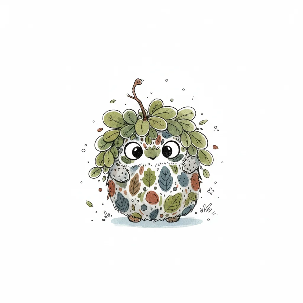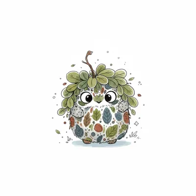 Niedliches, rundes Waldwesen mit Blättern als Fell und Haaren, im Aquarellstil.