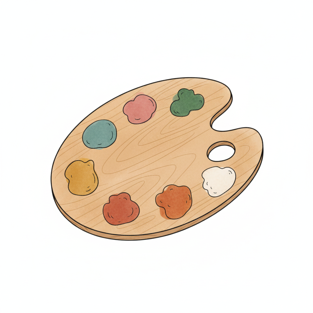 Illustration einer braunen Künstlerpalette mit bunten Farbtupfern.