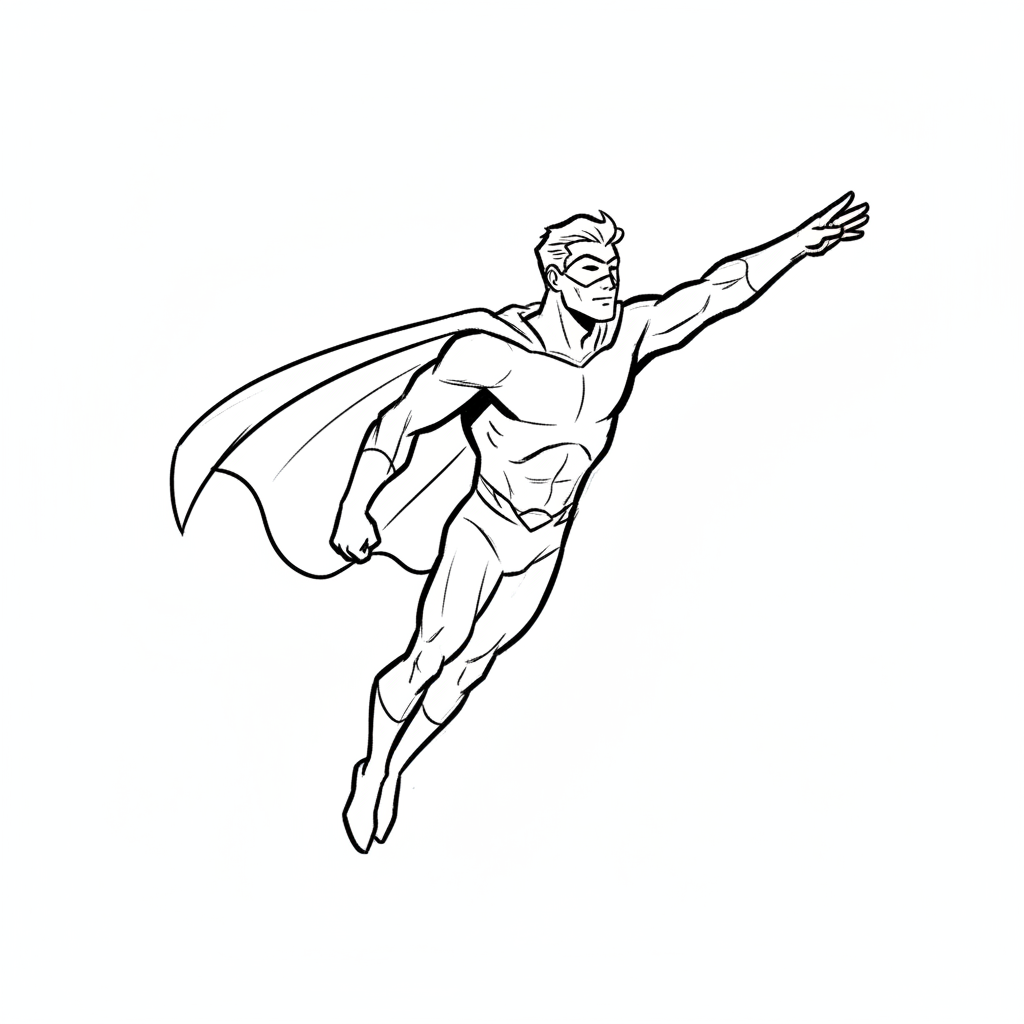 Schwarz-weiß-Zeichnung eines fliegenden Superhelden mit Umhang und Maske.