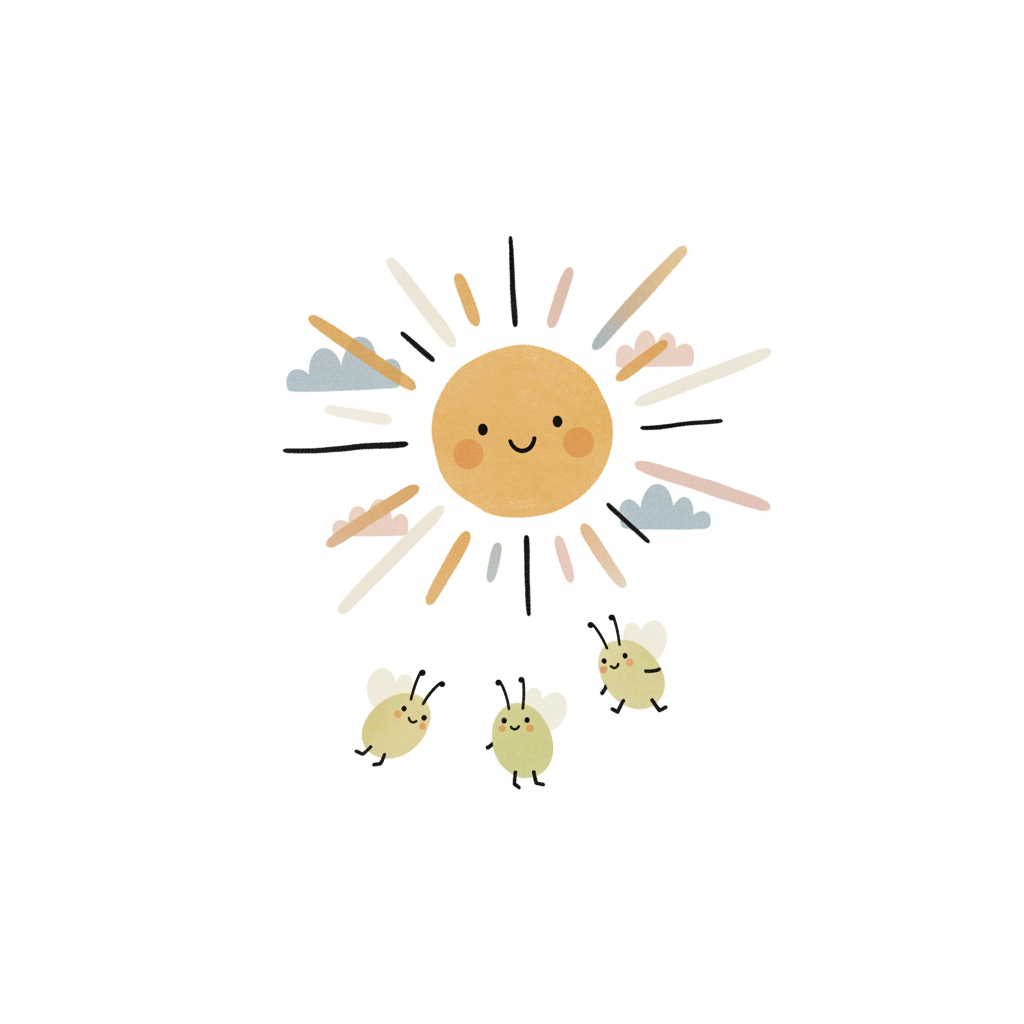 Niedliche Illustration einer lächelnden Sonne mit Wolken und drei kleinen, fliegenden Insekten.