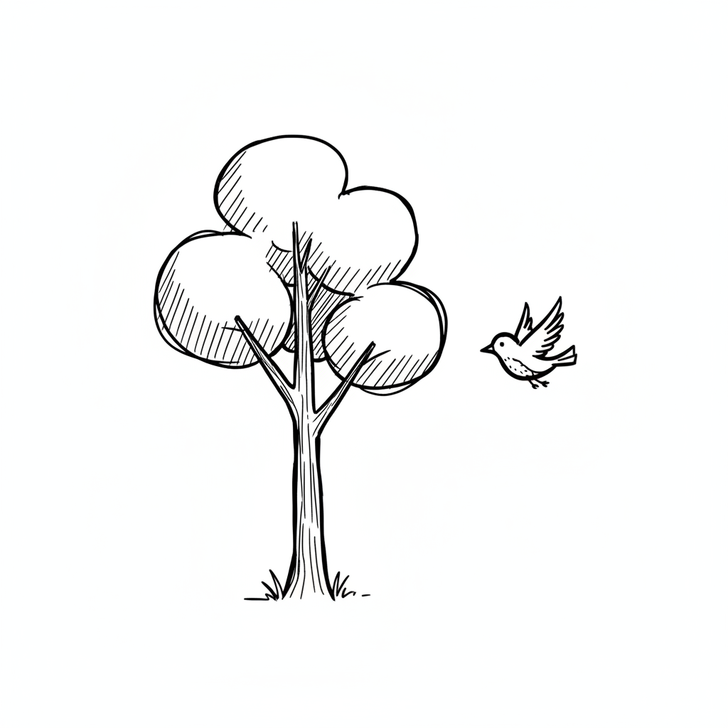 Handgezeichnete Skizze eines Baumes und eines fliegenden Vogels auf weißem Hintergrund.